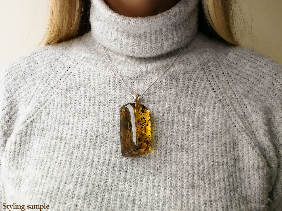Dark green and brown colors rectangle amber pendant on adjustable necklace
